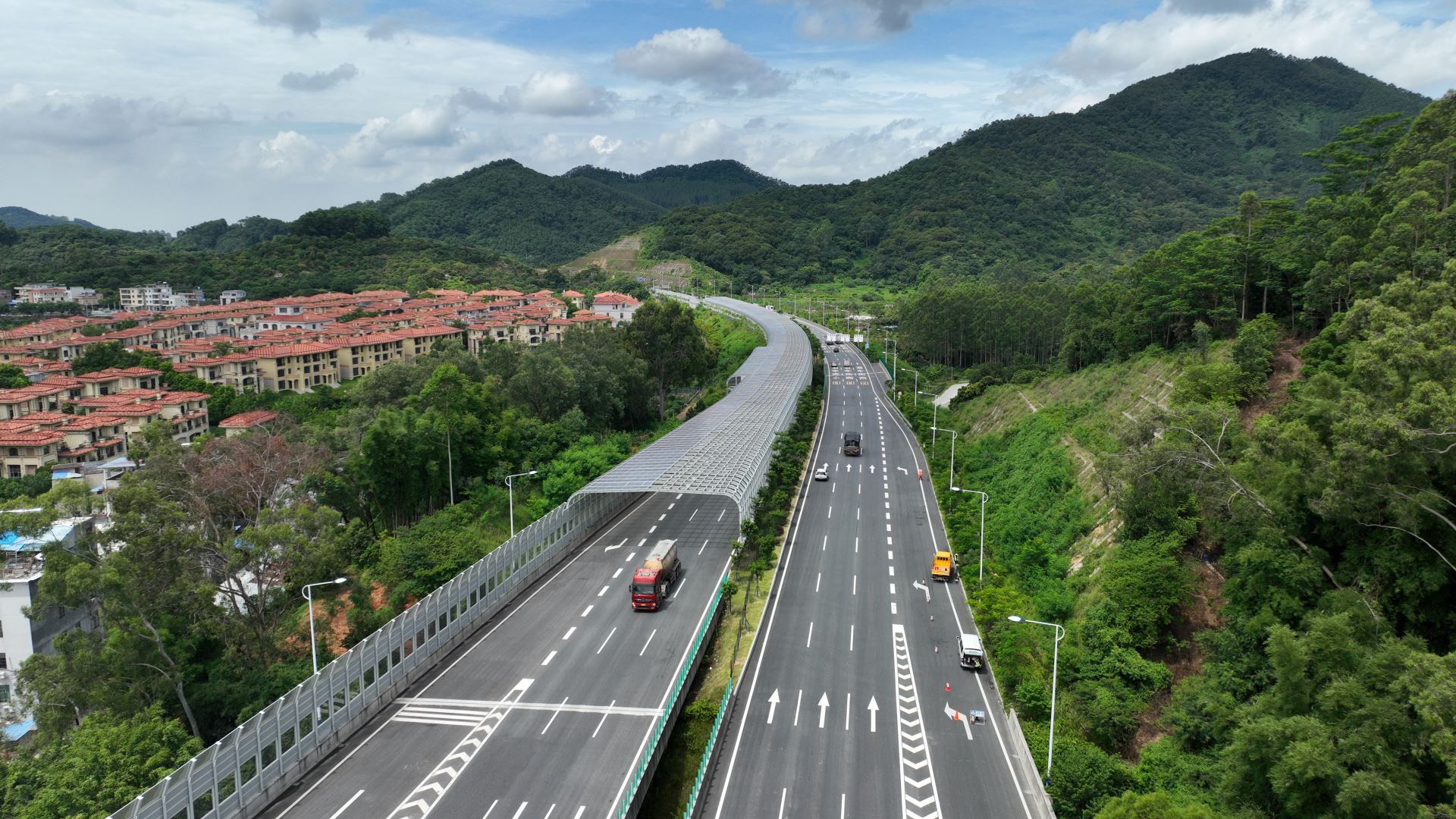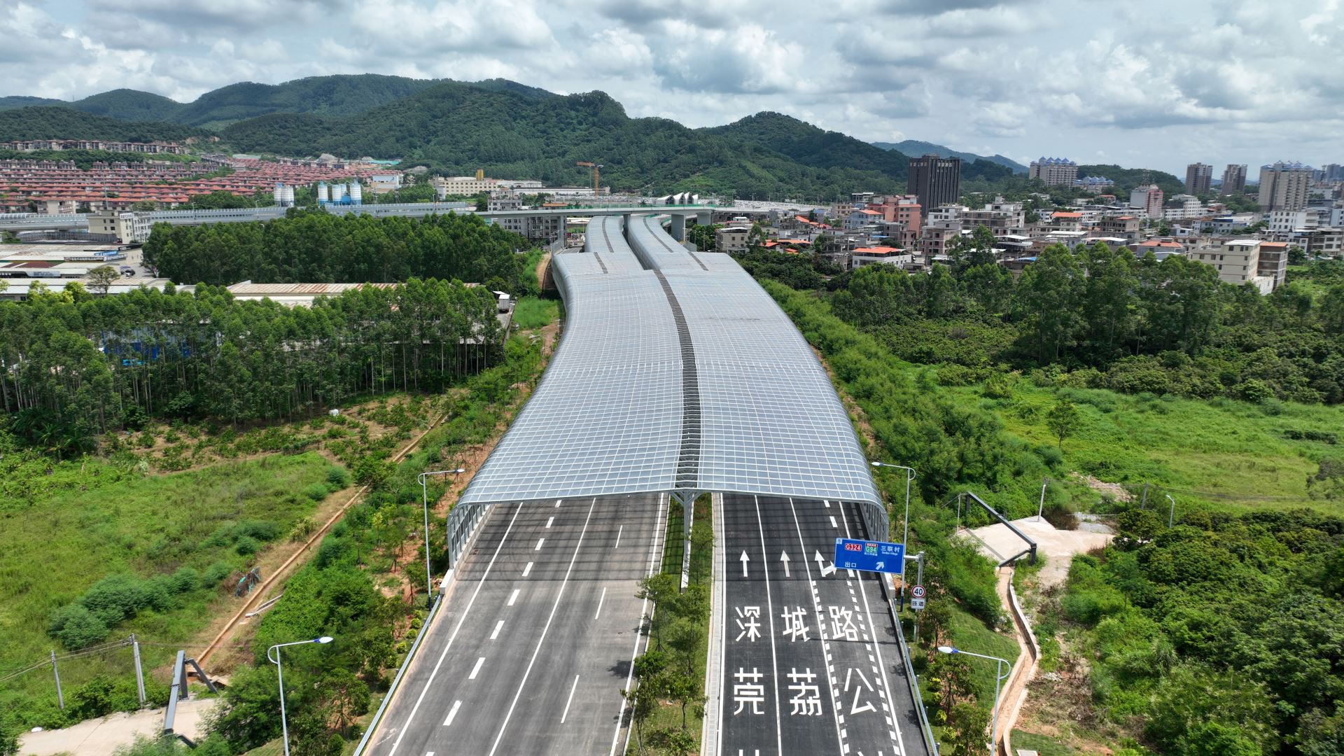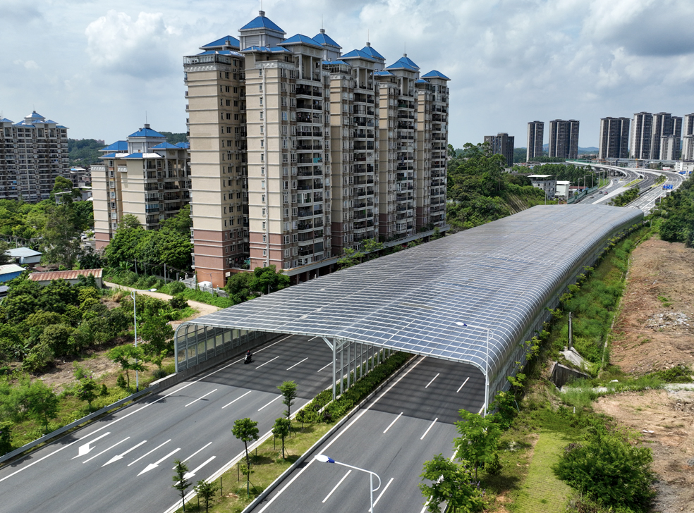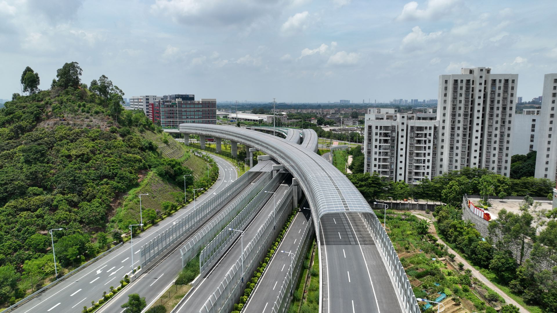 该项目位于广州市增城区,自增城区增城大道(三联立交-大国璟)起至广汕公路(华立学院南侧),声屏障总长度为3512m,设计总面积为76263.6㎡。声屏障结构分为折臂式、半封闭、全封闭三种形式,折臂式设计高度为5.2m,封闭式声屏障最大跨度为47.34m,是全国为数不多的大跨度声屏障项目,也是广州增城第一个全封闭声屏障项目。声屏障钢立柱采用H250*200外宽内窄的结构形式,侧部采用80mm金属吸隔声屏体与15mm加筋亚克力板,全封闭顶部透明板采用8mmPC板。