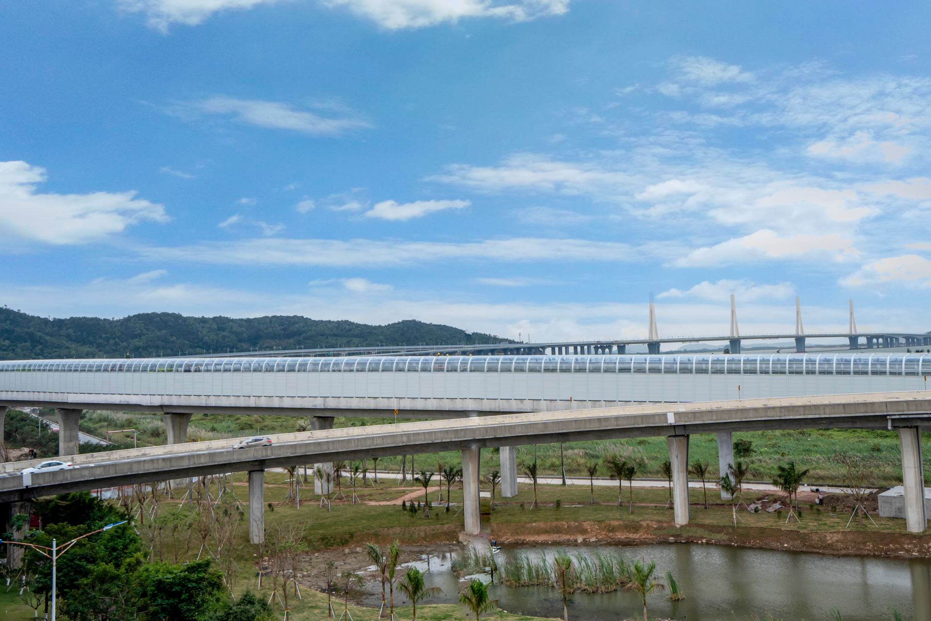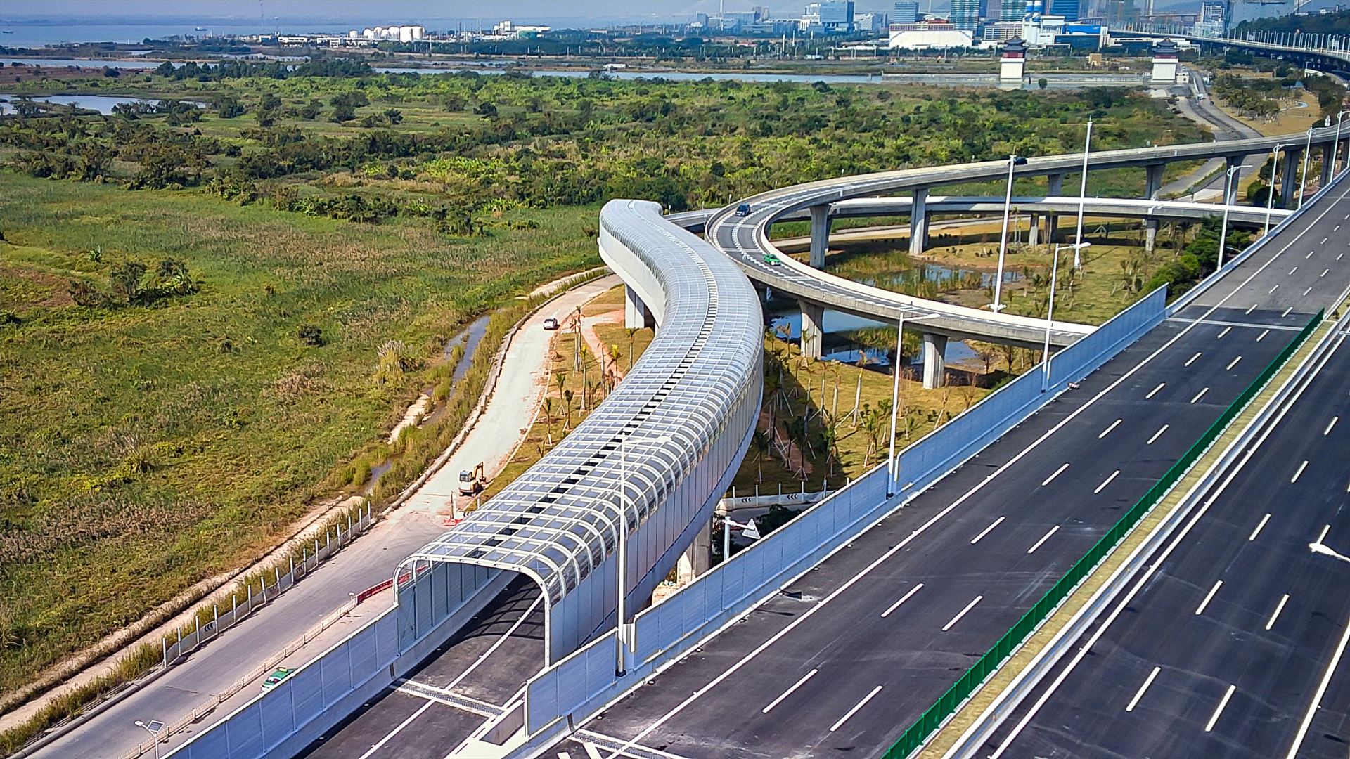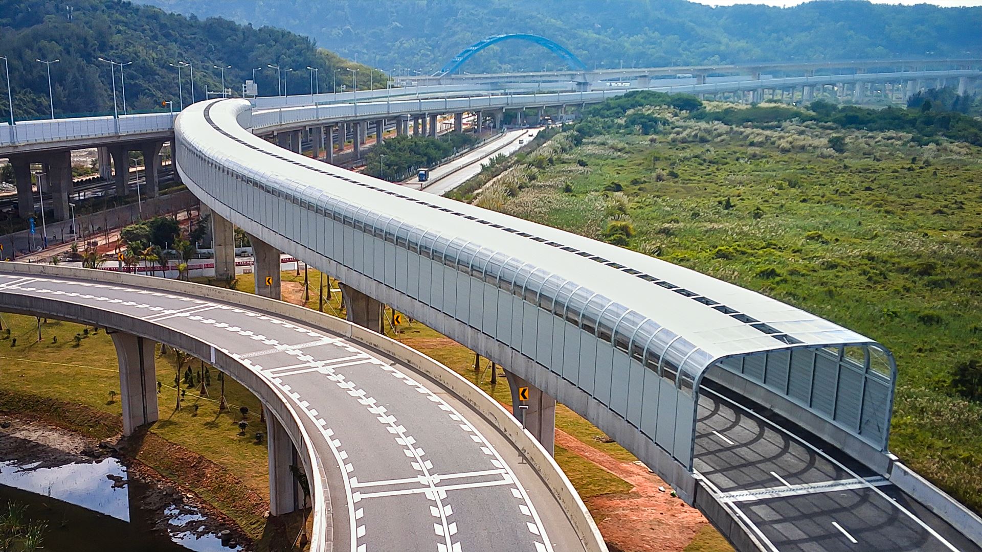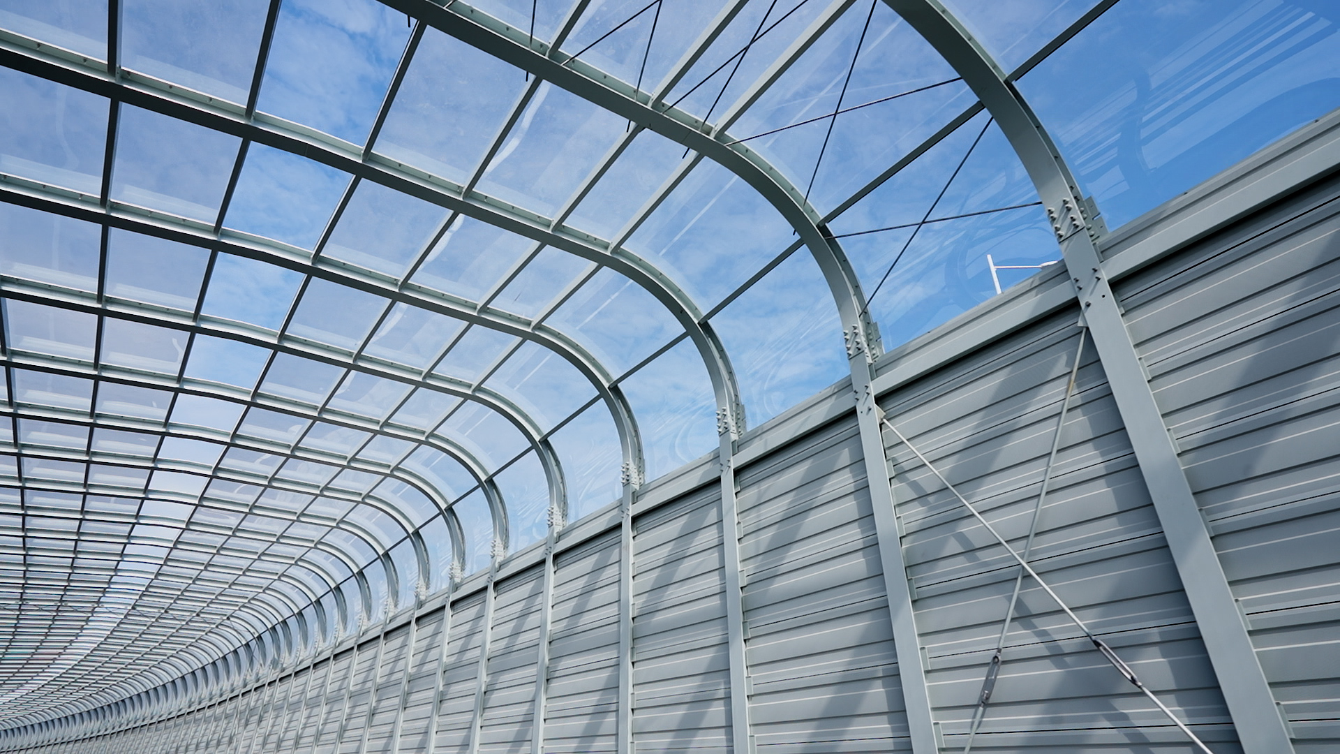 该项目位于广东省珠海市横琴大道与环岛西路交汇处,声屏障总长223m,设计面积约4000㎡。该项目为全封闭声屏障结构,侧面采用全金属板,顶部为外敷式透明PC板,跨距10m,是较为典型的公路桥梁全封闭声屏障结构样式。