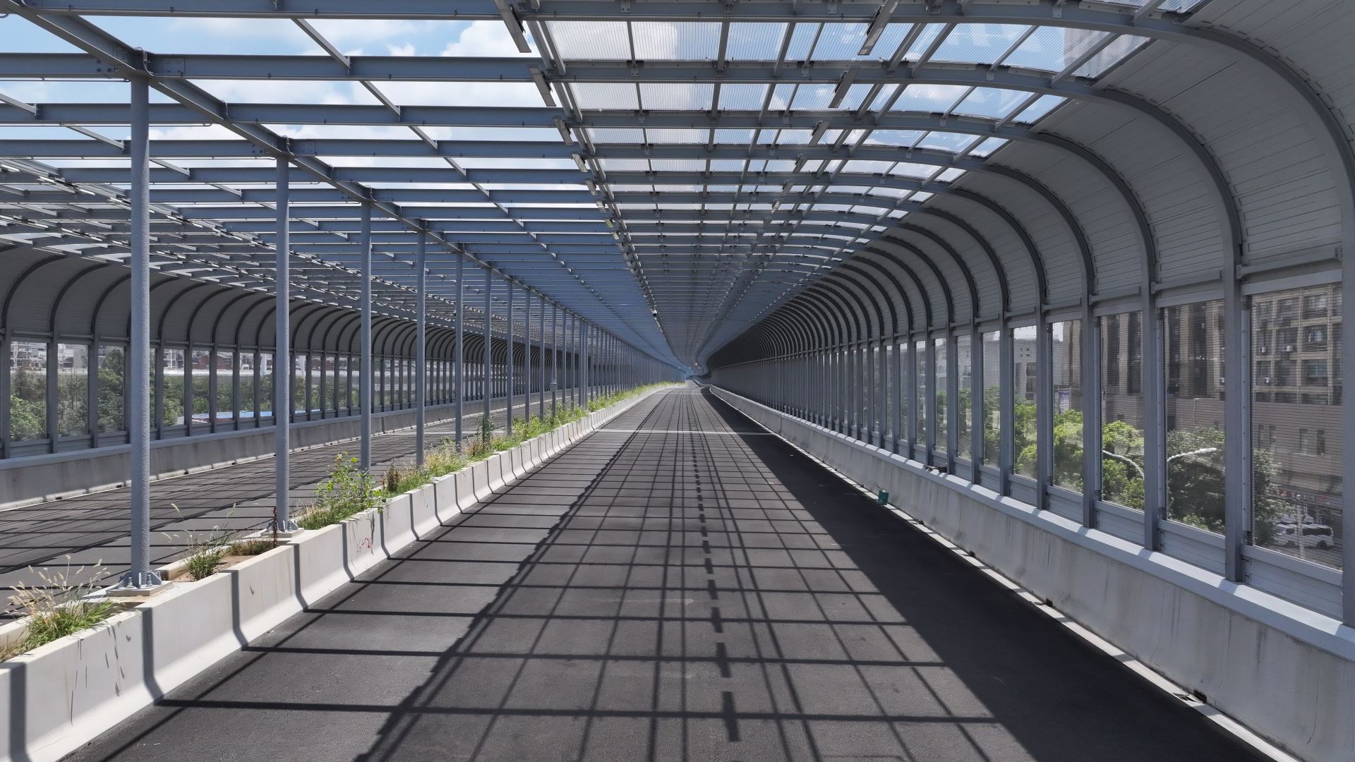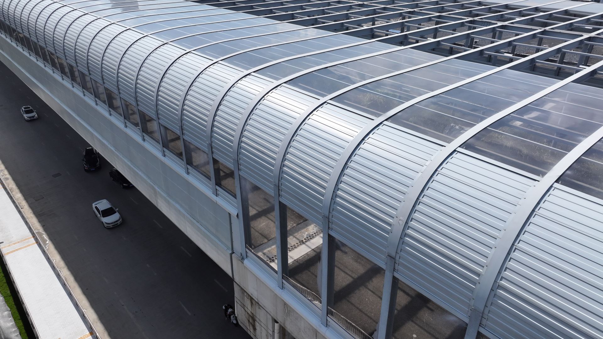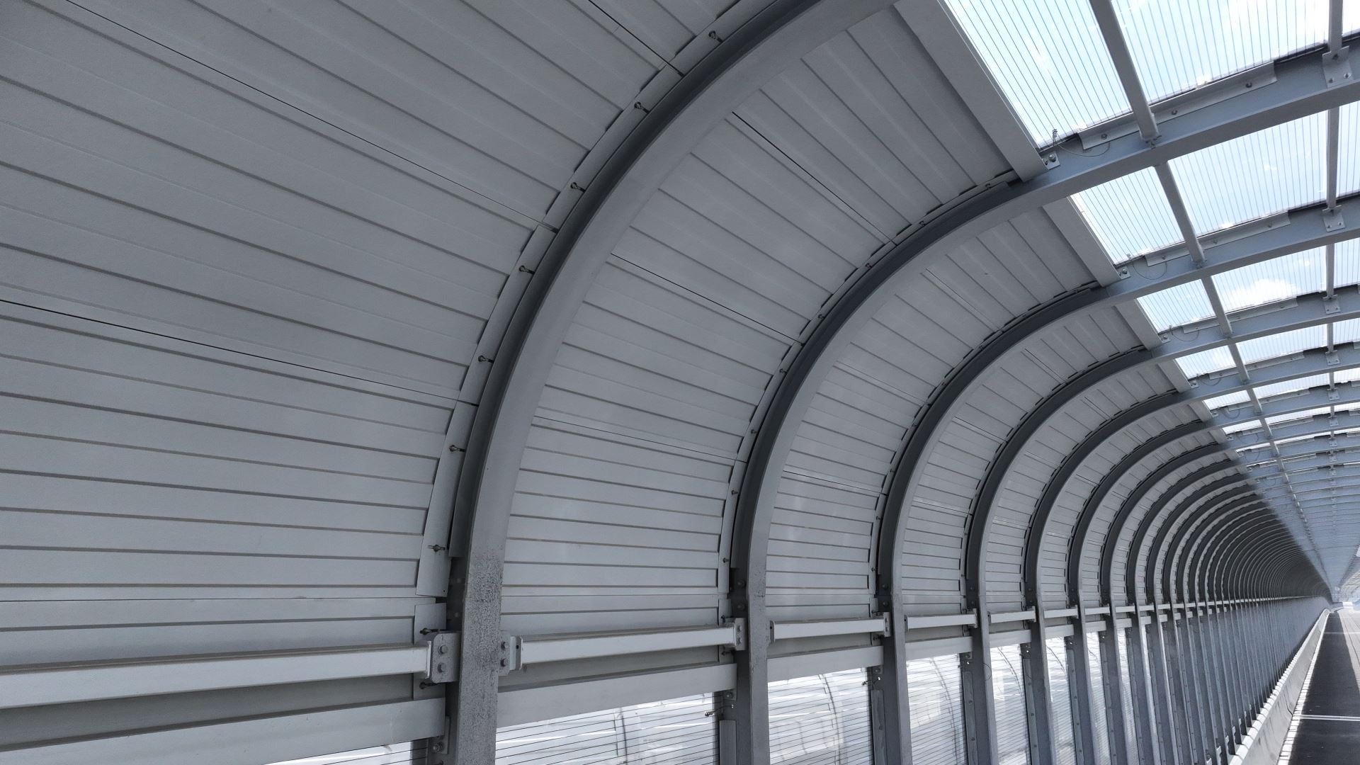 G107武汉市东西湖段(高桥二路至额头湾)全封闭声屏障工程位于湖北省武汉市东西湖区,交付面积约9万㎡,全长3.3km,整体采用全封闭式结构,最大跨度40m,是目前武汉已完工市政全封闭声屏障中单体体量最大的项目。