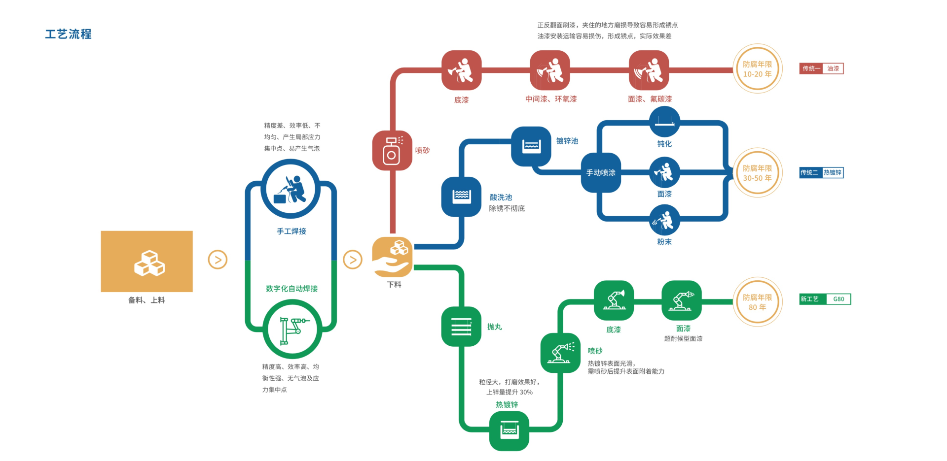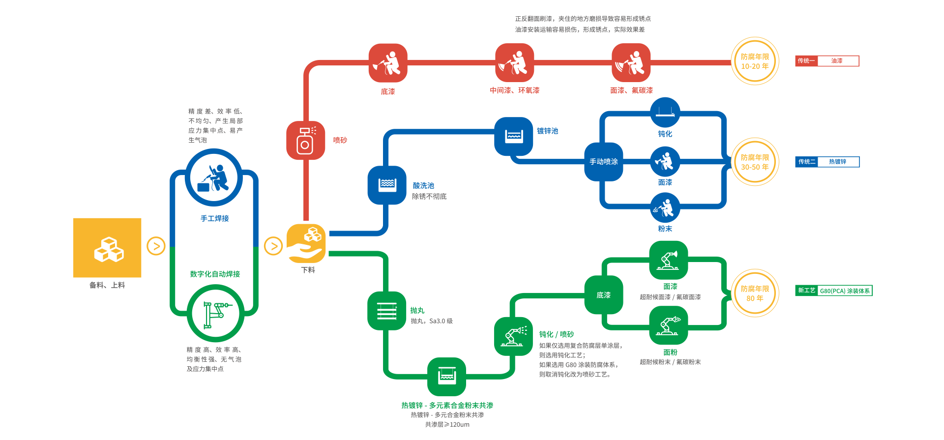 中驰为了打破传统声屏障钢结构防腐30-50 年寿命的行业技术瓶颈,与工业涂料领域专家联合研发,结合PCA技术经过科学论证及户外测试,最终确立了全新的80年防腐寿命声屏障钢结构G80(PCA)涂装工艺:抛丸、热镀锌-多元素合金粉末共渗、钝化/喷砂、喷涂中间漆、喷涂面漆/粉末。新型 SPZ®G80钢立柱产品的80年防腐工艺流程,如下图所示。